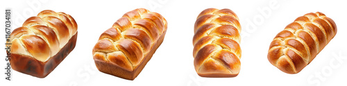 Assortment of freshly baked bread loaves including twisted braided and swirled designs showcased on a plain white background The breads display a variety of golden brown crusts and fluffy