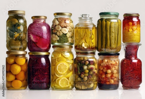 pickled, preserved, jar, glasses, vegetable, fruit, food, delicious, colourful, variety, assortment, homemade, pantry, storage, canning, pickling, cookery, ingredient, texture, natural, organic, fermented, canned, favor, fresh, epicure, produce, healthy, diet, nourishment, kitchen, closeup, bright, studio, arrangement, stacked, rustic, preservative, seasoning, yellow, green, red, purple, white, olive, lemon, cucumber