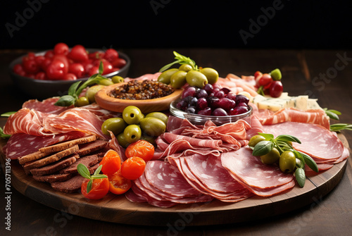 Assortment of Italian and Spanish sliced meat appetizer, prosciutto, salami and ham, with olives