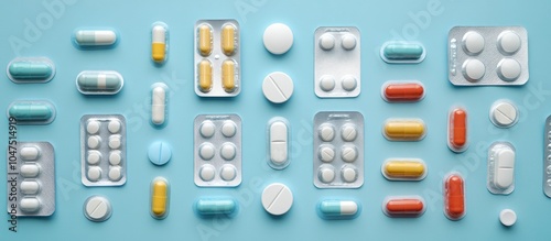 Assortment of Pills and Tablets on Blue Background