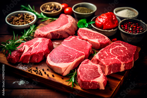 Assortment of raw beef meat steaks ready for grilling, accompanied by seasoning and utensils for a delicious barbecue experience.