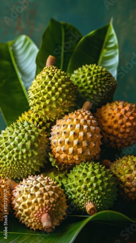 Assortment of Vibrant Tropical Fruits with Lush Green Leaves and Botanical Patterns in Natural Outdoor Setting