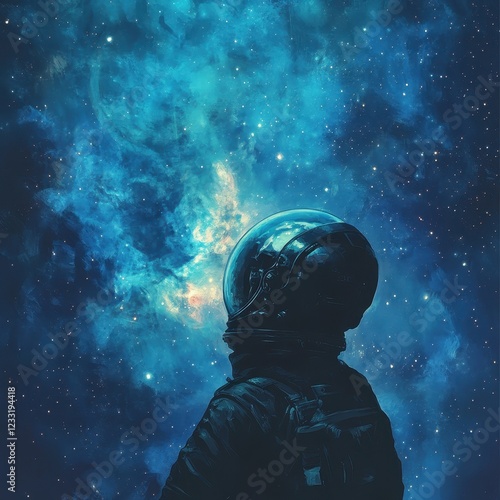 astronaut, space, nebula, cosmos, star, galaxy, universe, night, sky, dark, blue, cosmic, celestial, wonder, mystery, exploration, adventure, immensity, infinite, visor, gazing, contemplating, observing, silent, peaceful, serene, tranquil, majestic, awe, inspiring, breathtaking, solitude, journey, discovery, perspective, depth, distance, light, darkness, dream, imagination
