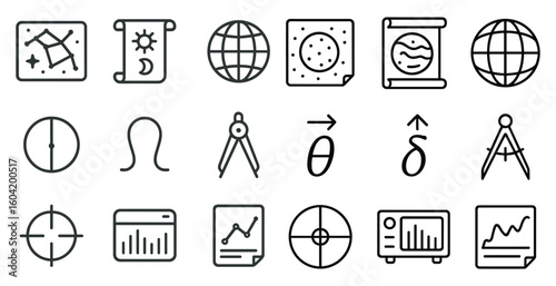 astronomy, star, night sky, planet, celestial bodies, outline, linear, vector, icon, set, universe, cosmos, telescope, galaxy, chart, orbit, zodiac, astrological, planetary