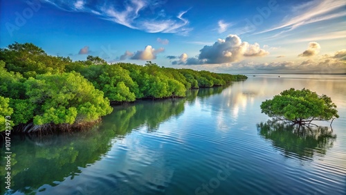 Asymmetrical lush mangrove forest meeting serene ocean horizon