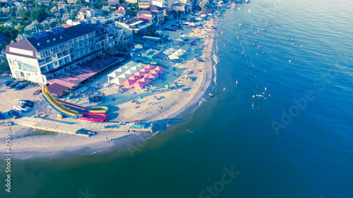 At dawn. Seashore, beach, inflatable slides and a vintage car with a surfboard on the trunk.