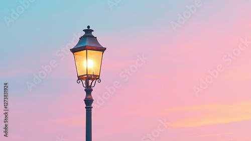 At sunset, a vintage street lamp shines brightly, its warm light contrasting with the colorful sky, as seen in a close-up photograph that epitomizes the urban lighting concept, perfect for creating