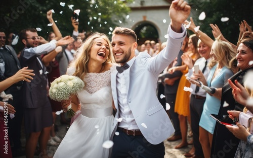 wedding, couple, married, celebration, marriage, love, bride, happy, people, man, bouquet, family, suit, romantic, young, groom, happiness, dress, woman, romance, flower, beautiful, ceremony, wife, beauty, female, outside, human, relationship, husband, together, elegant, summer, white, kiss, portrait, tender, hugs, lifestyle, bridal, loving, hug, male, smile, lovely, party, confetti, generative, ai