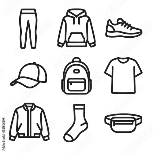 icon, grid, outline, icon, set, leggings, hoodie, sneaker, baseball, cap, backpack, oversize, tee, bomber, jacket, sport, sock, waist, pack, line, baseball cap, bomber jacket
