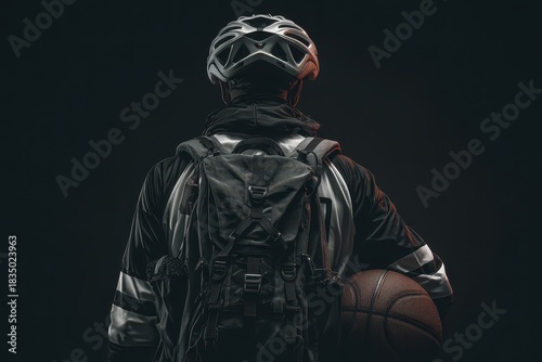 Athlete in jersey with backpack wears bicycle helmet while holding basketball preparing for outdoor sports