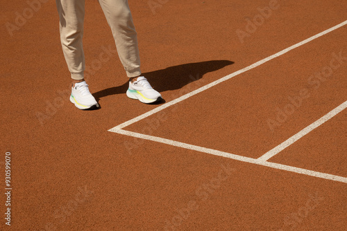 Athlete legs on beige sports field. Sport concept for active workout at sunny day. Copy space
