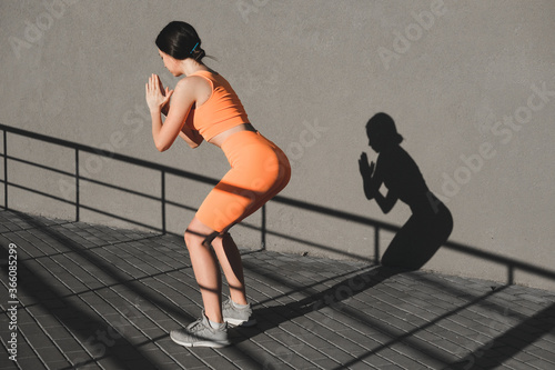 Athletic girl crouches with dumbbells. Sporty fitness woman in leggings and top outdoors doing leg workout and squats