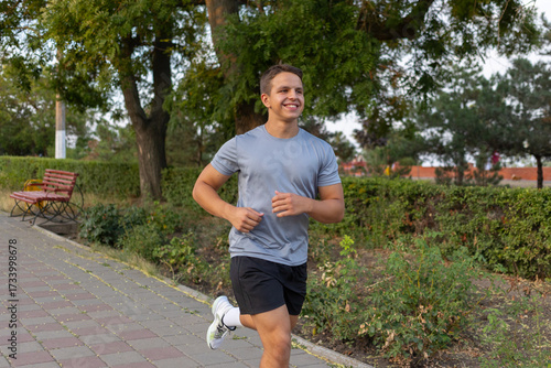 Athletic guy running outdoors in the city park, healthy lifestyle concept.
