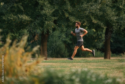 Athletic man running through a park during daylight, embracing fitness and nature in a vibrant outdoor atmosphere