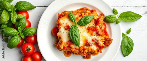 Atop view of cheesy meat lasagna, vibrant vegetables, and basil on a white plate, food styling, hearty