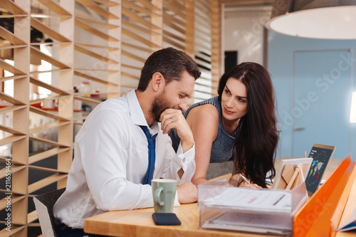 Attraction. Delighted dark-haired woman seducing her boss while standing at his table