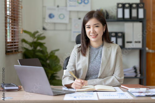 Attractive Asian businesswoman with laptop in office With a bright smile and looking at the camera.