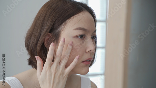 attractive beautiful short hair asian woman worry looking into mirror for face skin care condition. Frustrated Young female Examining Her Face While Looking At The Mirror in bathroom. annoy facial age