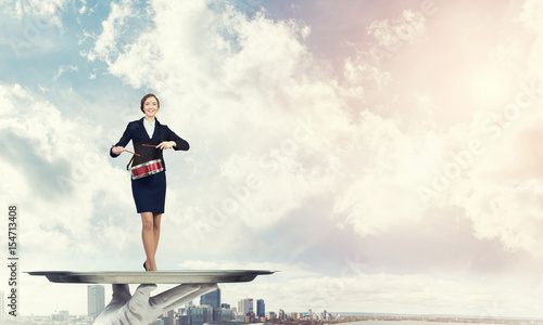 Attractive businesswoman on metal tray playing drums against cityscape background