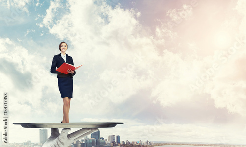 Attractive businesswoman on metal tray with red book in hands against cityscape background