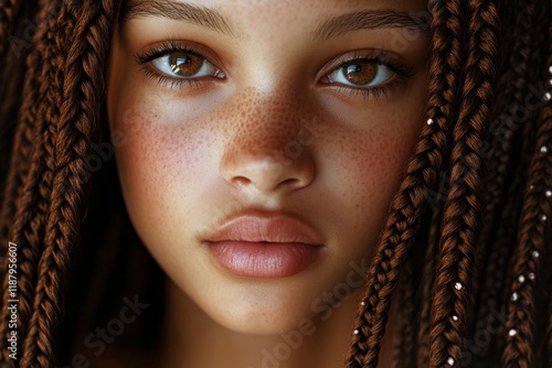 Attractive calm mixed-race girl - for ads, media and digital marketing use. Commercial digital ads creative. Long hairdo - braids hair. African american hair concepts inspiration.