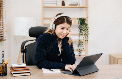 Attractive happy Asian student studying at the college library, sitting at the desk, using a laptop computer, tablet and headphones having a video chat..