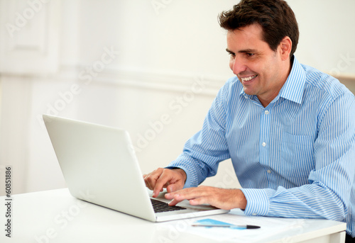 attractive, male, entrepreneur, working, laptop, smiling, sitting, office, desk, copy space, 30s, adult, alone, blue, businessman, charming, computer, guy, photogenic, hispanic, latin, looking, man, 1, people, person, shirt, smile, using, white, workplace