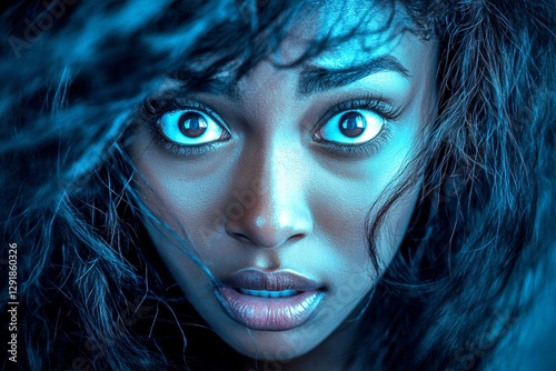 Attractive very astounded black girl - for ads, magazine ad and digital marketing use. Long haircut - beach waves hair. Commercial ad idea. Long hair woman portrait concepts. Long hair woman.