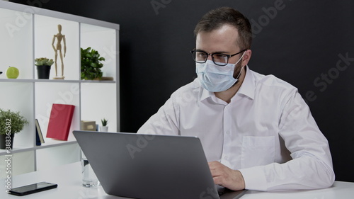 Attractive young businessman in white shirt, glasses and protective mask working away from office (telecommuting) at laptop during quarantine due to coronavirus global pandemic, self isolation at home