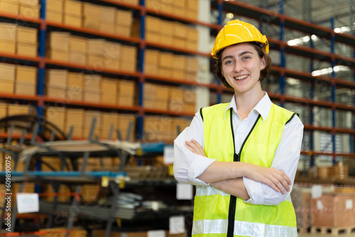 attractive young engineerwoman smiling and working engineering in industry.Portrait of young female worker in the factory.Work at the Heavy Industry Manufacturing Facility concept.