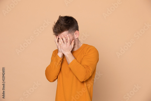 guy, yellow, silence, anger, sad, fear, frightened, depression, shame, anxiety, terror, negativity, forbid, afraid, scared, cry, adult, young, 20, male, model, photogenic, casual attire, portrait, beard, attractive, person, people, stylish, studio, white, man, lifestyle, 1, caucasian, background, beauty, face, beautiful, style, spanish, fashion, blond