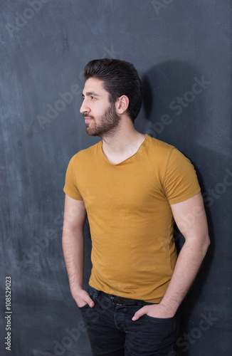 Attractive young man against blackboard.