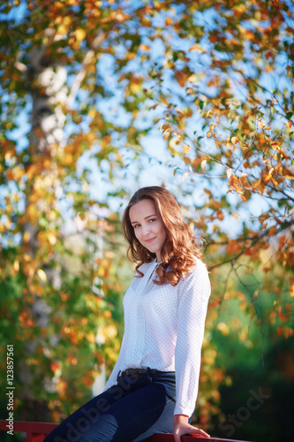 Attractive young woman sitting in colorful autumn park, vertical shoot