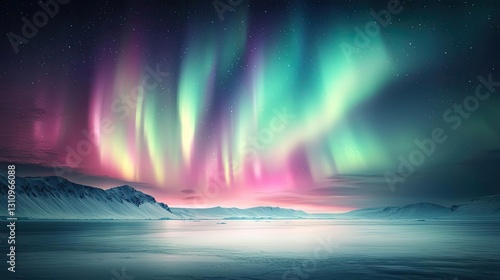 Aurora borealis northern lights concept. Stunning aurora borealis illuminating the night sky over frozen terrain.