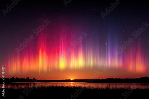 aurora, borealis, northern, light, sunset, sunrise, night, sky, colourful, high-coloured, red, orange, purple, pink, yellow, lake, water, landscape, calm, tranquil, nature, star, misty, glow, light, vibrant, dramatic, beautiful, evening, horizon, forest, tree, silhouette, calmness, majestic, spectacular, phenomena, celestial, atmosphere, radiant, brilliant, fading, streak, fantastic, imaginative, colours, huge, night time