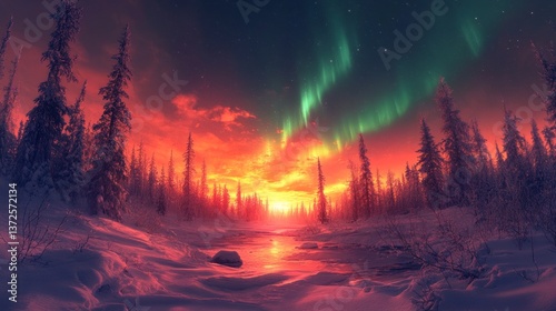 Aurora Borealis Over Frozen River Landscape. Winter Wonderland, Ethereal Glow, And Snow Covered Trees.