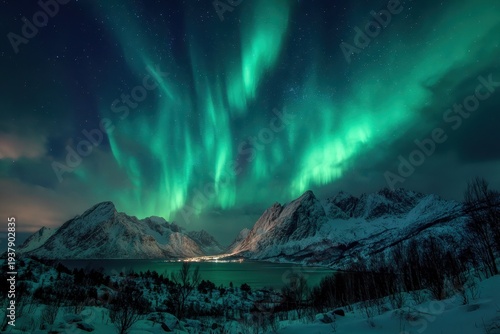 Aurora over snow‑capped Lofoten mountains in Norway during a quiet winter night
