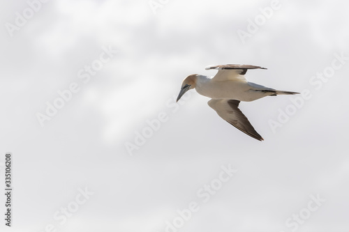 Australasian gannet in flight against white sky, ready to dive for fish