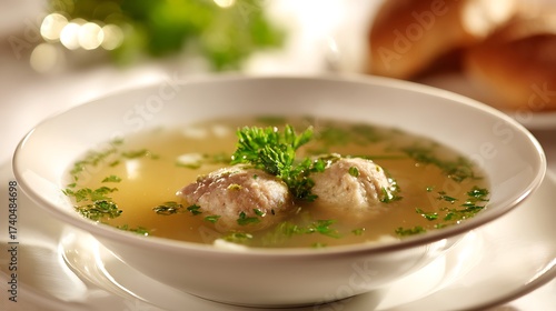 Austrian leberknödelsuppe isolated in a deep white bowl, clear broth with liver dumpling, fresh parsley, green and yellow lighting accentuating lightness