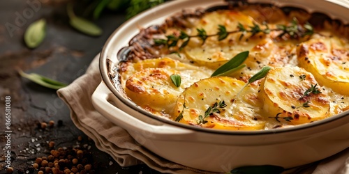 Authentic Au Gratin Dauphinois Potatoes A Close-Up of Deliciously Baked Potatoes in Butter Cream. Concept Comfort Food, Gourmet Cuisine, Potato Dishes, Close-Up Photography, Food Styling