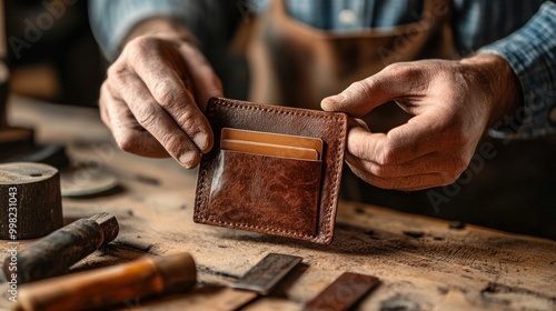 Authentic cow leather wallet card holder with a leather tool on a wooden craft item
