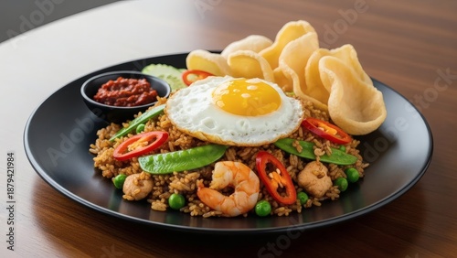 Authentic Indonesian Nasi Goreng Fried Rice with Shrimp Sunny Side Up Egg and Prawn Crackers on Black Plate