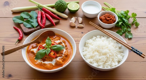 Authentic thai red curry with rice, fresh ingredients, on wooden surface