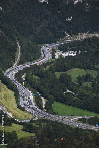 aerial, alps, asphalt, car, countryside, curve, drone, forest, expressway, from above, green, highway, landscape, line, mountain, nature, outdoors, path, plant, road, route, scenery, scenic, sky, traffic, transport, transportation, travel, tree, trip, truck, vegetation, vehicle, view