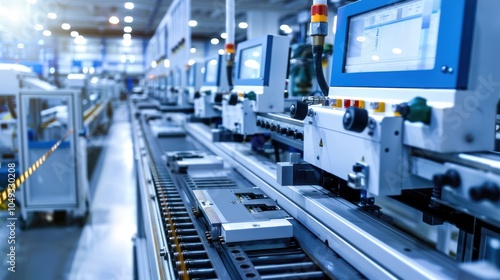 factory, assembly, line, conveyer, machinery, automation, production, industrial, manufacturing, equipment, technology, process, system, belt, metal, steel, machine, part, product, component, electronic, digital, screen, panel, control, buttons, knob, light, bright, modern, clean, efficient, workflow, operation, automated, robotic, workspace, innovation, progress, future, industry, engineering, design, science, development