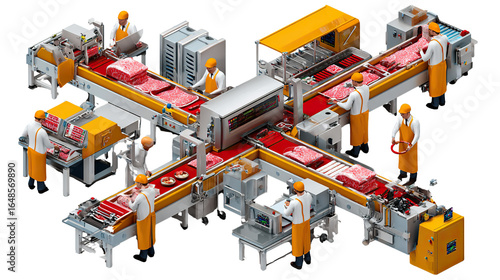 Automated Food Processing: A detailed, overhead view showcases a streamlined food processing plant, depicting the precise steps involved in producing a food product