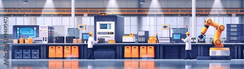 Automated manufacturing facility with advanced machinery, industrial robots, and workers in white coats. High-tech production line.
