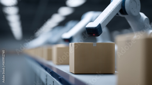 Automated robot arm sorting cardboard box on conveyor in smart warehouse, efficient, modern, technology