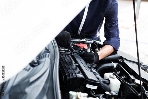 Automobile mechanic repairman hands repairing a car engine automotive workshop with a wrench, car service and maintenance , Repair service