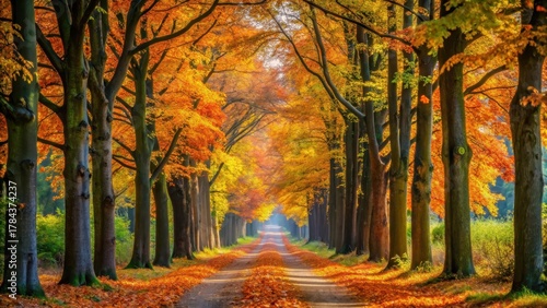 Autumn Alley Amidst Tall Trees with Vibrant Foliage